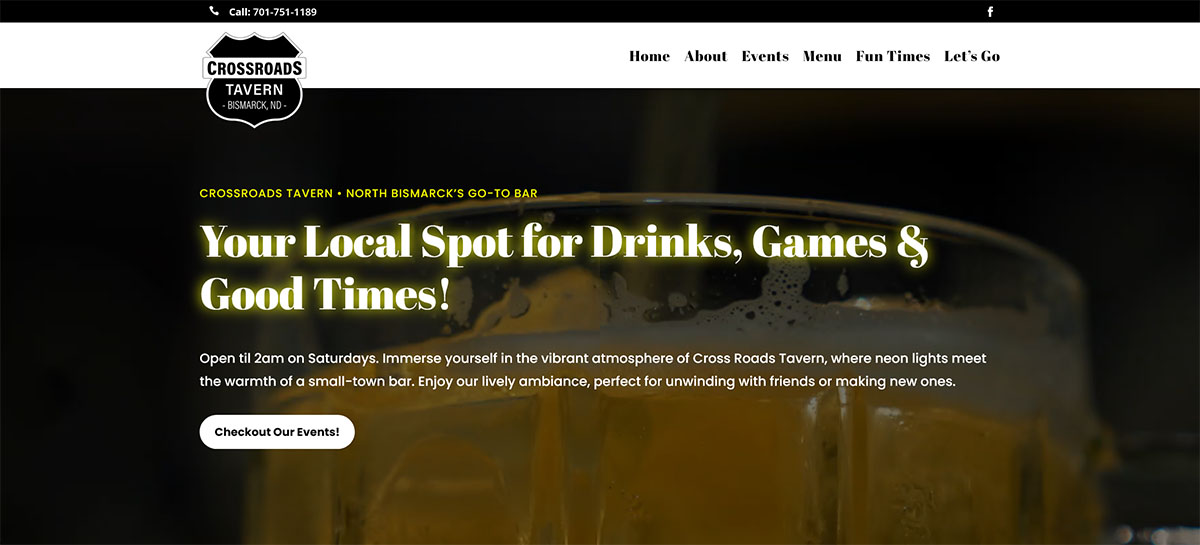 Crossroads Tavern is a well-known local spot in Bismarck where good food, cold drinks, and live entertainment come together. It’s the kind of place people meet up for lunch, stay for happy hour, and come back on the weekends for live music and events. Crossroads has built a strong local following by being consistent, welcoming, and fun, and their website needed to reflect that same experience online. When visitors land on the Crossroads Tavern website, they should immediately get a feel for the atmosphere: the energy, the events, and the food that keeps people coming back. The goal was to create an online presence that feels just as inviting as walking through the front door.